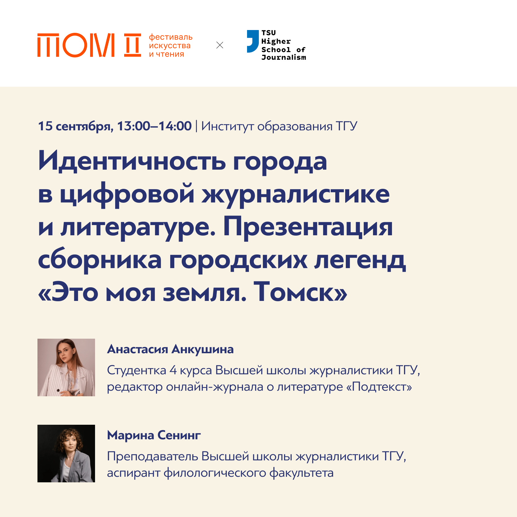 — Идентичность города в цифровой журналистике и литературе. Презентация сборника городских легенд «Это моя земля. Томск», регистрация: https://clck.ru/3DBAJq