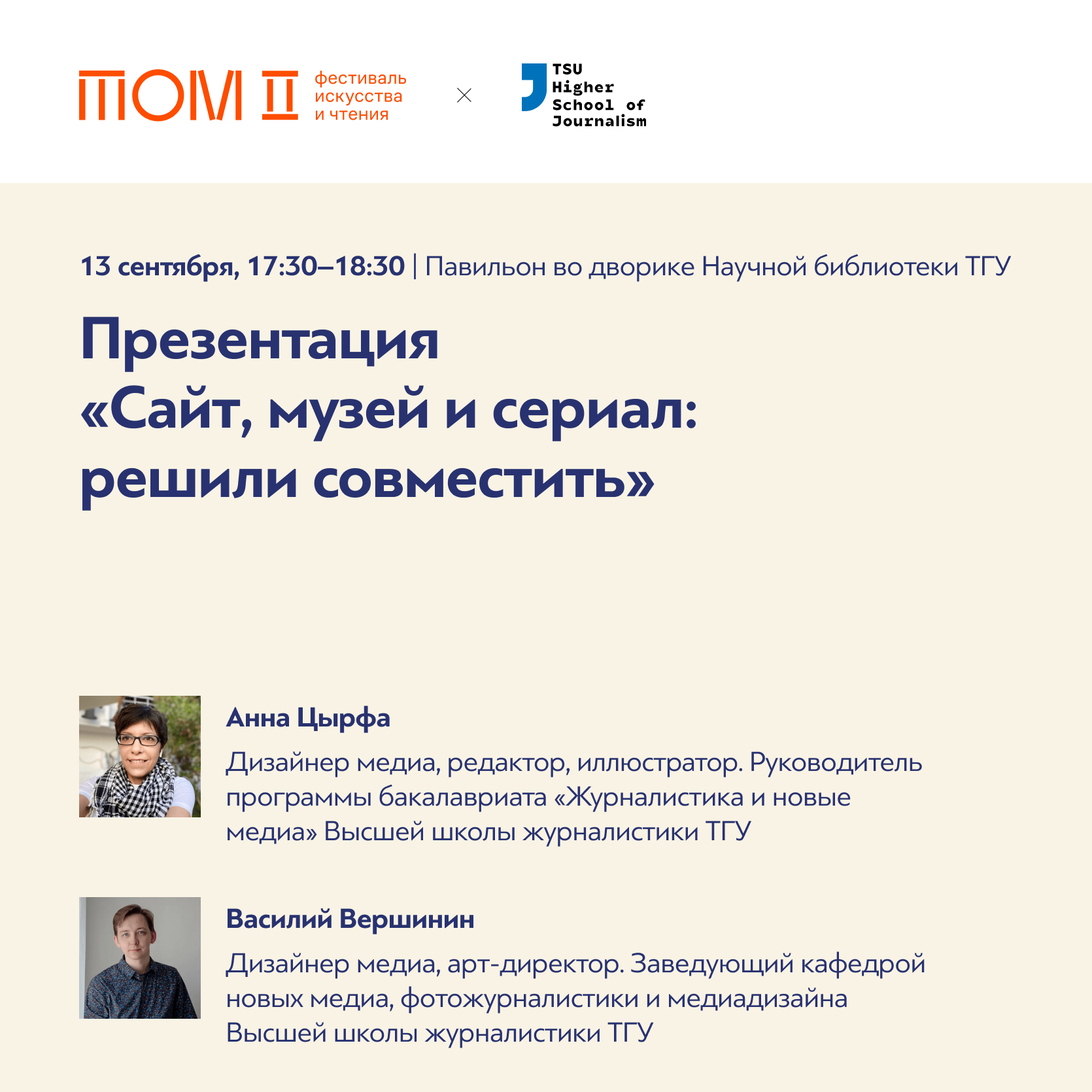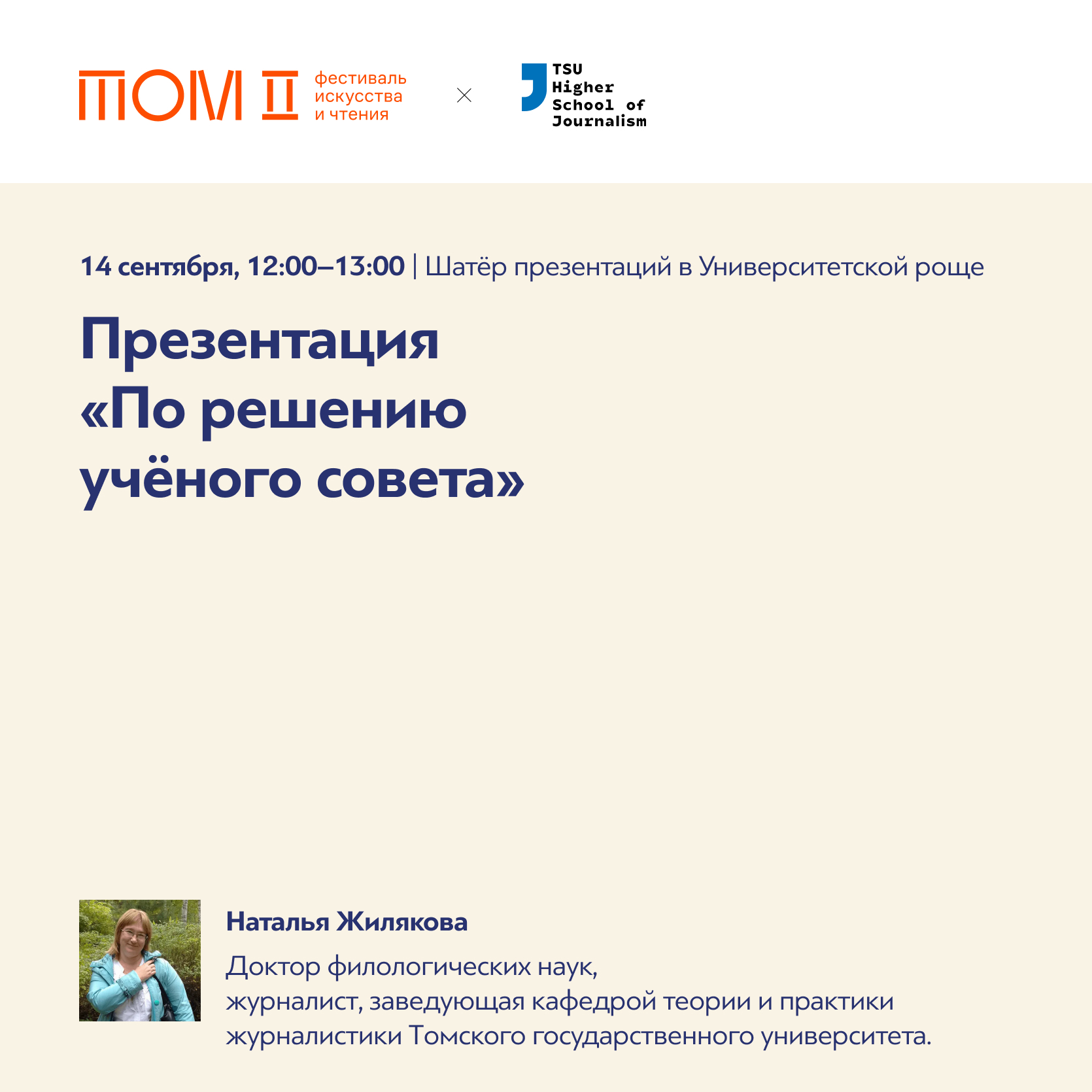 Преподаватели, сотрудники и студенты Высшей школы журналистики ТГУ выступят на фестивале искусства и чтения «ТОМ». Фестиваль проходит 12-15 сентября в Университетской роще. Программа на сайте → https://tom-books.art/